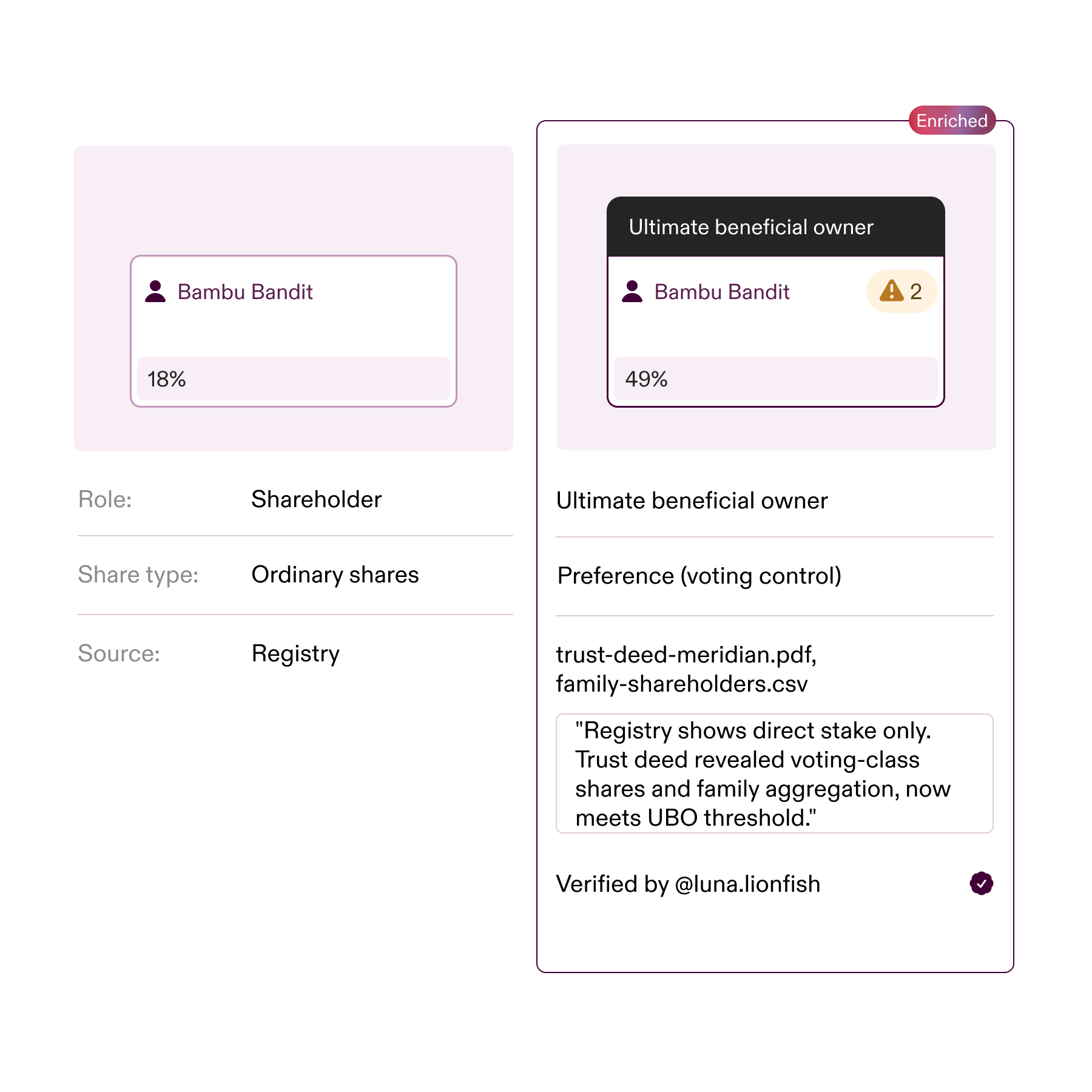 New shareholder. Changed address. Missing UBO. Sub-threshold aggregation that adds up to control.